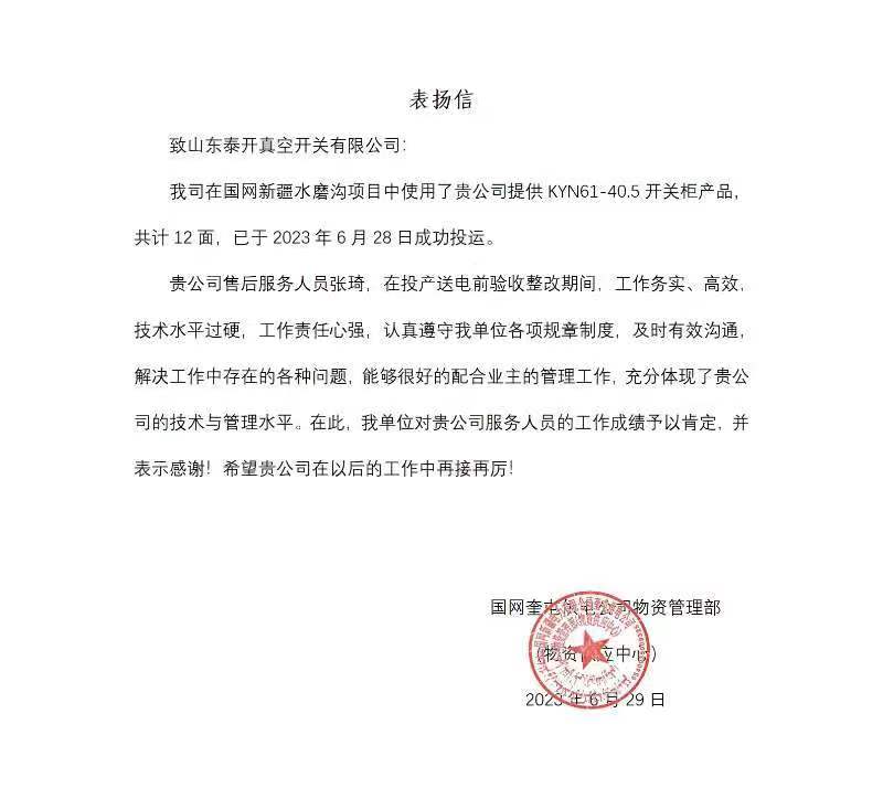 公司收到來自國網(wǎng)奎屯供電公司的表揚(yáng)信,信中用戶表達(dá)了對公司產(chǎn)品的認(rèn)可以及對售后服務(wù)工作的肯定。公司售后服務(wù)人員專業(yè)、務(wù)實(shí)、高效的工作作風(fēng),得到了國網(wǎng)奎屯供電公司的一致好評。